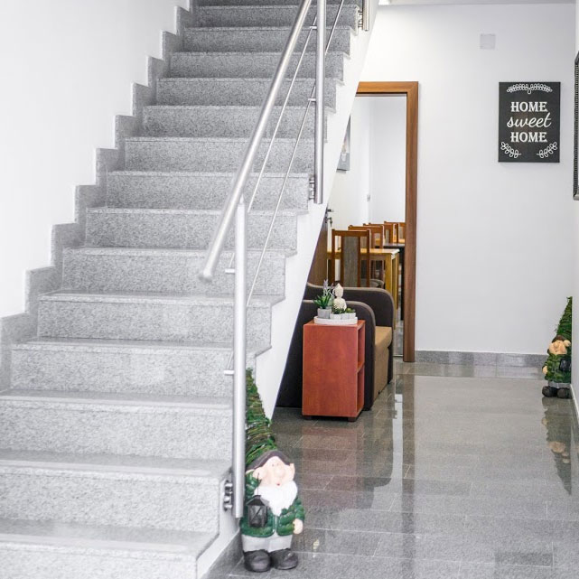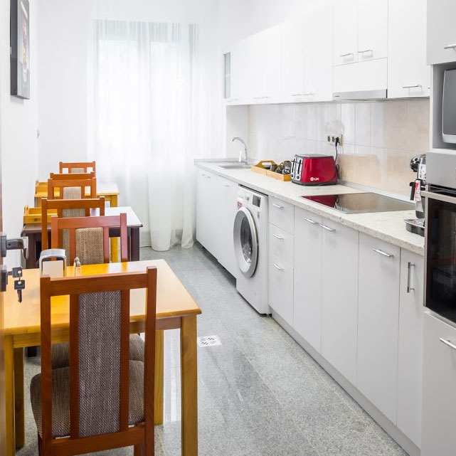Camerele sunt distribuite pe 2 etaje, un total de 7 camere duble si 13 camere single plus salon de servit mic dejun cu bucatarie utilata complet inclusive masina spalat vase si masina spalat haine, cu acces liber pentru toti turistii.