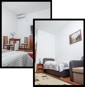 Toate camerele sunt de dimensiuni generoase, amenajate la standarde superioare, echipate standard cu mobilier nou, cu baie proprie, aer conditionat, minifrigider, televizor LCD si internet Wireless gratuit pe tot amplasamentul. Camerele dispun de canapea care poate fi folosit in caz de nevoie ca pat suplimentar.